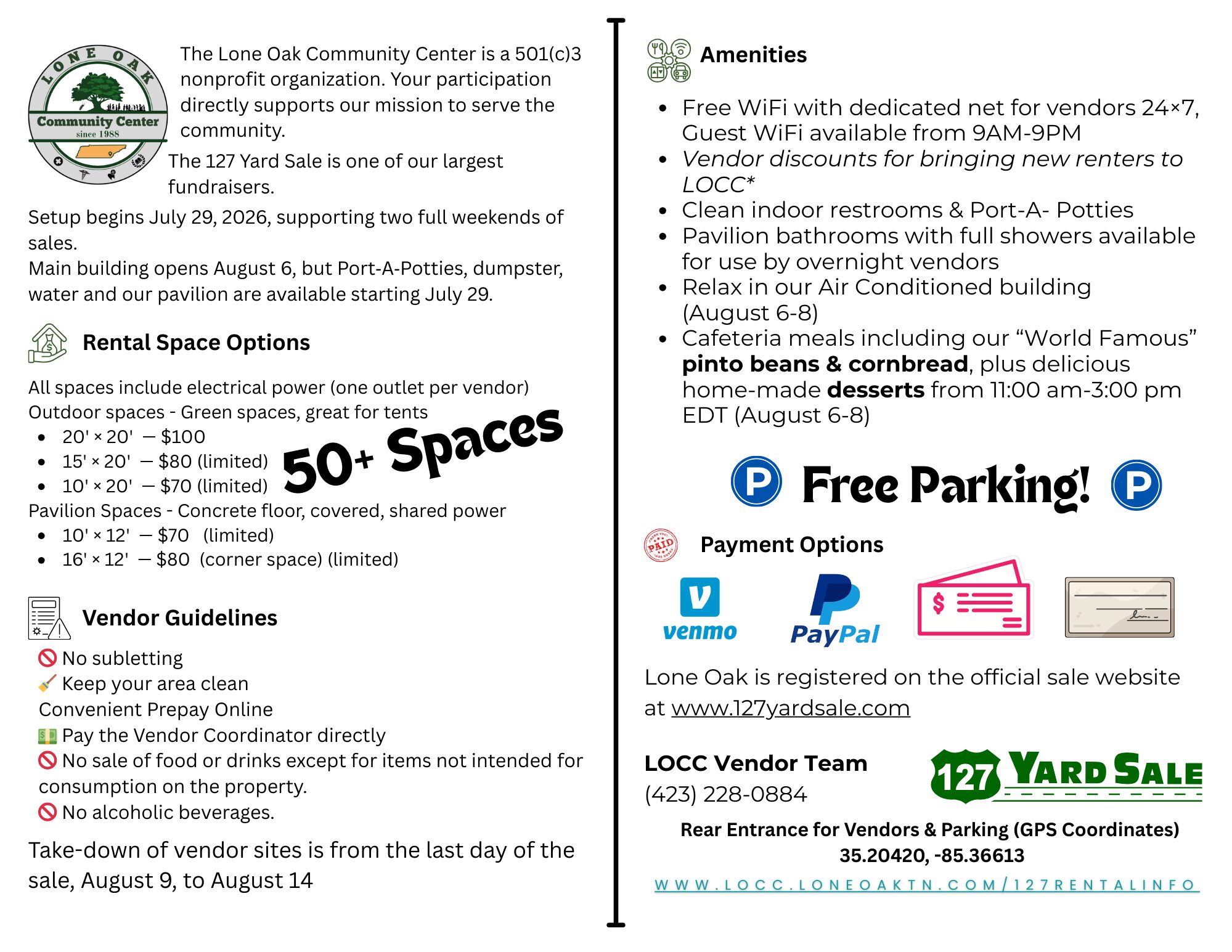 Team Contact (423) 228-0884 Call or Text LONE OAK COMMUNITY CENTER ATTN: Vendor Team P.O. Box 394 SIGNAL MOUNTAIN, TN 37377
