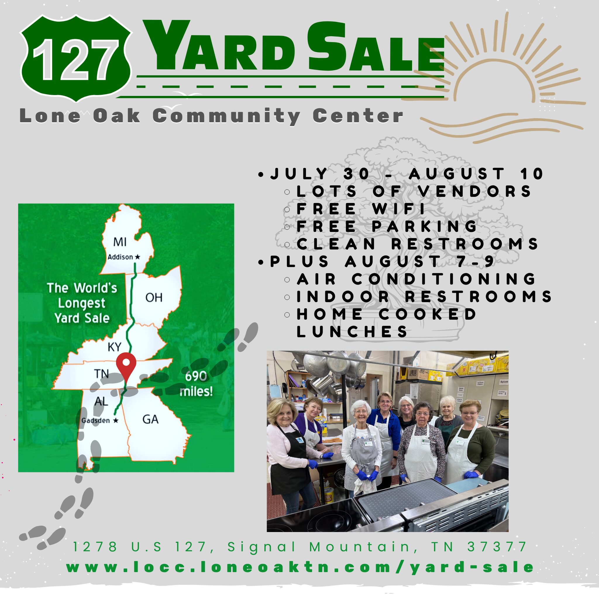 127 Yard Sale Join UsIt’s the World’s Longest Yard Sale!Read More + Add to Google Calendar + iCal / Outlook export Date Aug 07 - 09 2025 Expired! Time 8:00 am - 6:00 pm Location LOCC 1278 U.S Hwy 127, Signal Mountain, TN 37377 Category 127 Sale Organizer Lone Oak Community Center Website https://locc.loneoaktn.com Share this event