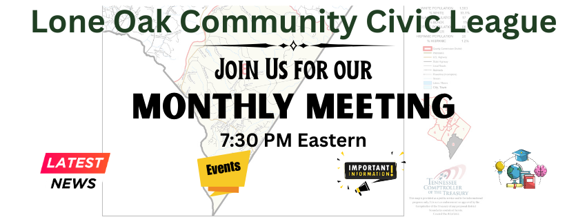Monthly Meeting Sequatchie County Sheriff’s Report Sequatchie County Commission Report Sequatchie County School Board Report District 8 Constable Report Lone Oak Volunteer Fire Dept Report LOCC Clinic Report Quilters Report Guest Speakers More… + Add to Google Calendar + iCal / Outlook export 00 days 00 hours 00 minutes 00 seconds Date Feb 05 2026 Time All times Eastern 7:30 pm Location LOCC 1278 U.S Hwy 127, Signal Mountain, TN 37377 Organizer Lone Oak Community Civic League Website https://locc.loneoaktn.com Share this event